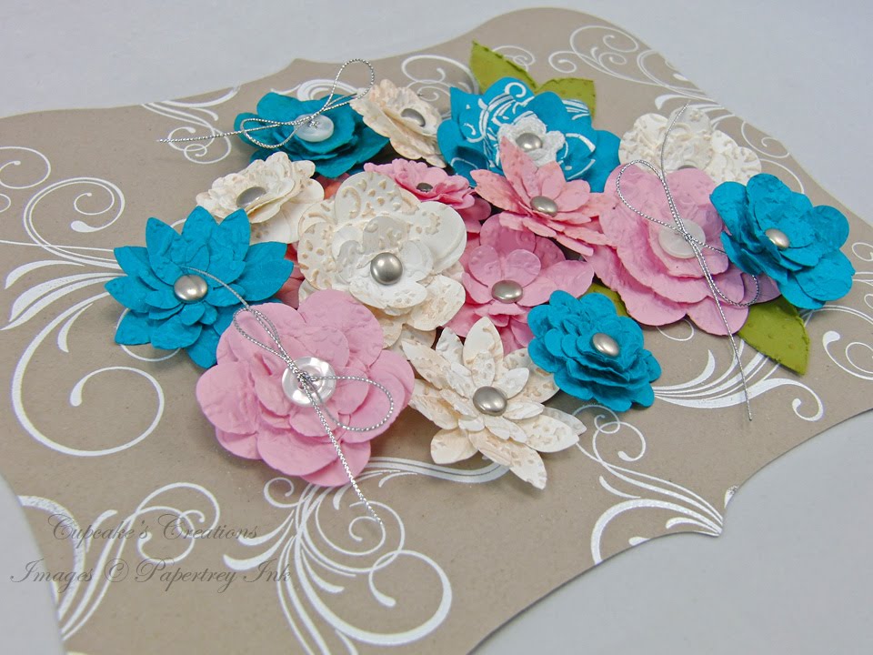 I cut a mat using my Cricut Expressions & the Accent Essentials cart to show the flower emellishments. I stamped some flourish images using VersaMark then embossed with Filigree white embossing powder.