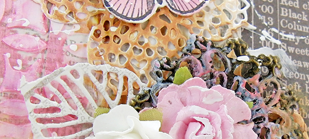 I added texture using a Prima stencil and embellished with various Prima trinkets, flowers and die cuts: