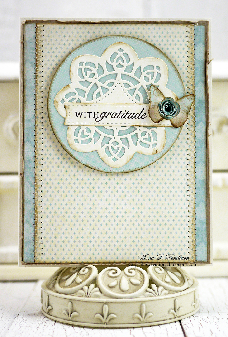 Beautiful cards, Mona! Like the subtle colors and prints in this collection. lovely doily and rose, too. :)