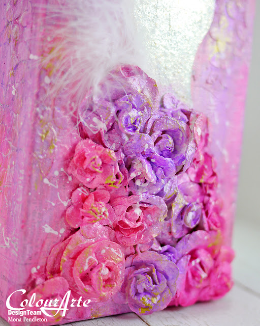 Hi there! I hope you are having a great week! Now that we are nearly settled in our new home, I have more time to create so I made a colorful and dimensional project to share featuring a variety of ColourArte products including several of the newly released products: Silks Acrylic Glaze:Apple Blossom, Plum Blossom and Radiant rain Shimmering Mist: apple blossom along with many other fabulous ColourArte products listed below.